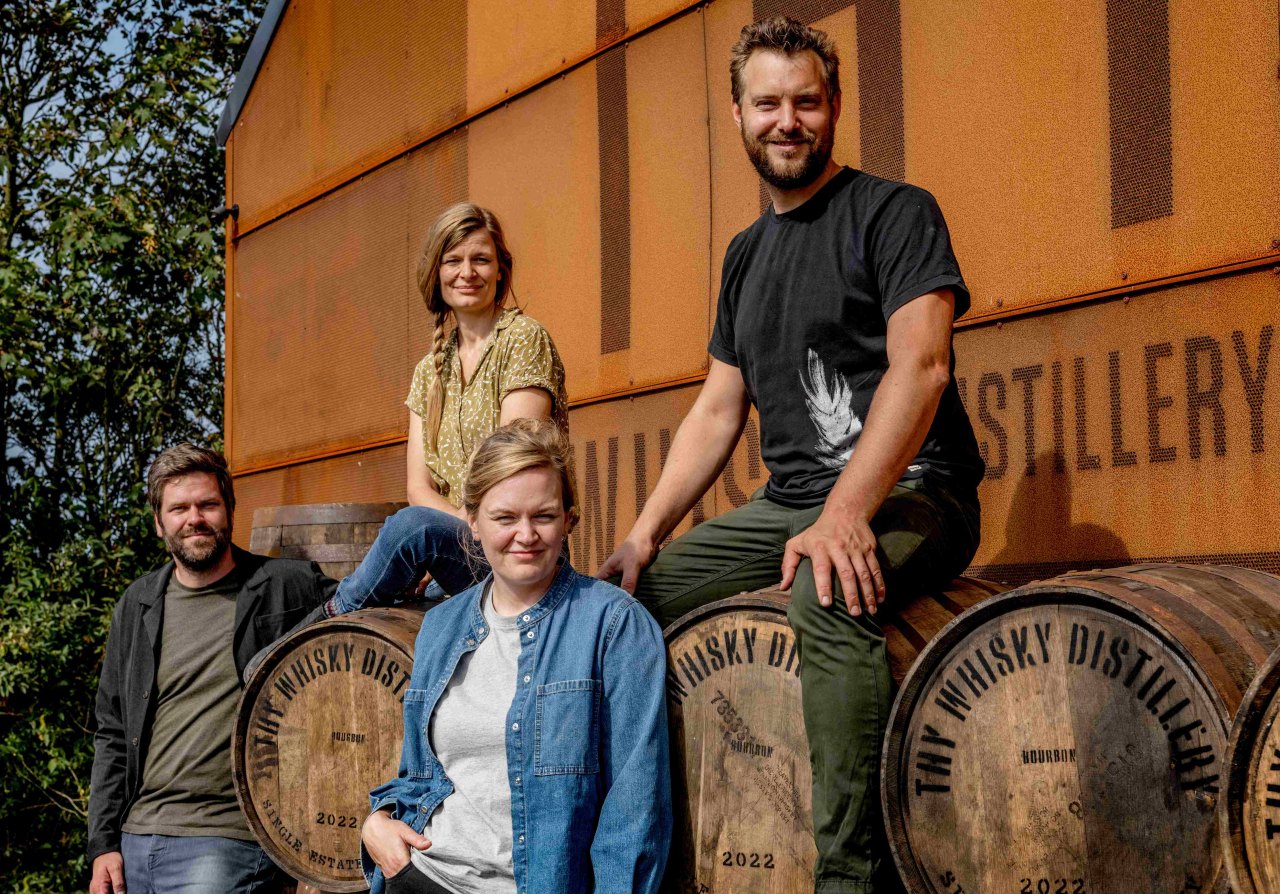 Dürfen wir vorstellen: Ellen und Marie Nicolajsen mit ihren Ehemännern Andreas und Jakob. Gemeinsam führen sie den Hof Gyrup, seit 1773 in Familienbesitz, seit 2010 mit Destillerie. Hier stammt alles aus einer Hand: Die Bio-Gerste für den Thy Whisky wächst auf den eigenen Feldern, gemälzt, gedarrt und gebrannt wird vor Ort, auch die Fasslagerung und selbst das Abfüllen der Flaschen passieren auf dem historischen Dreiseithof. Das gibt’s in Schottland nicht.