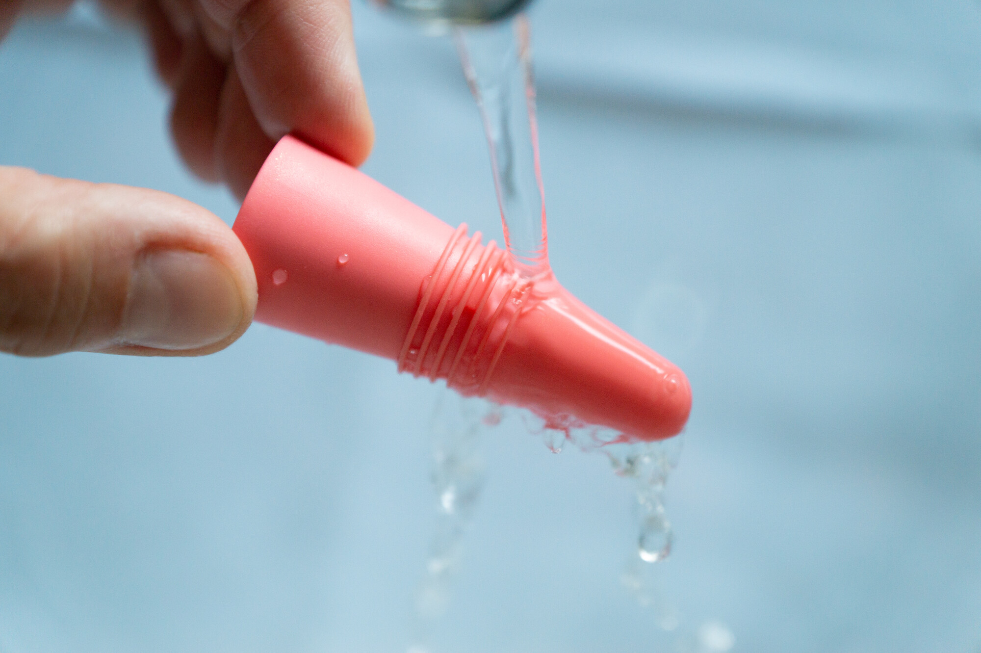 Robuster Flaschenstopfen aus flexiblem Platin-Silikon. Am oberen Ende befindet sich ein rund eingelassener Einsatz aus Edelstahl, der festen Griff beim Hereinschieben und Herausziehen des „Korkens“ gibt. Durch die Kegelform und die sechs Lamellen können Flaschen (wieder) dicht verschlossen werden.