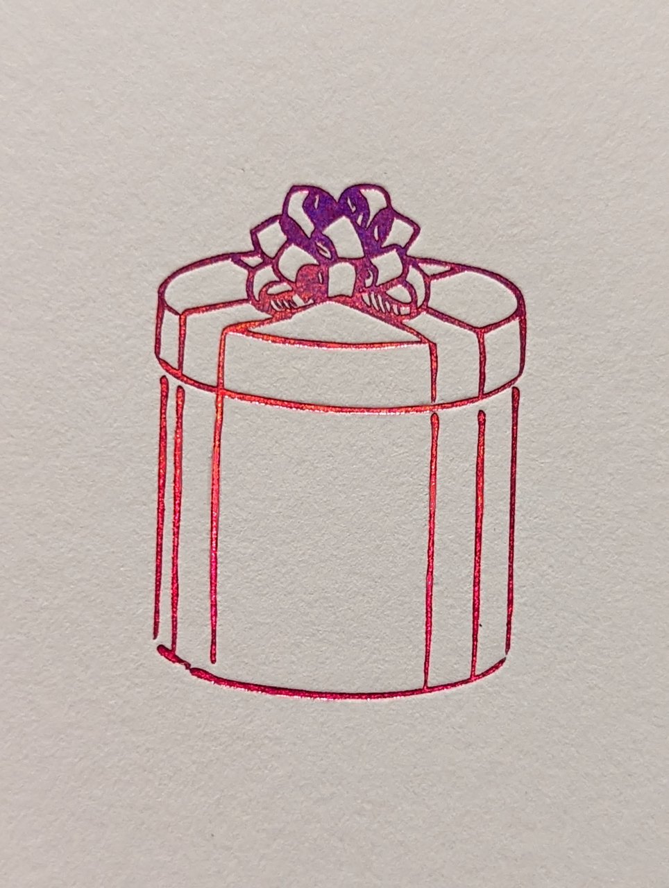 Hochwertige Klappkarte aus der Berliner Prägewerkstatt Edition Herzberg. Motiv: Geschenk, Prägedruck in changierendem Rot, glänzend. Fedrigoni Feinpapier 300 g/m², ungestrichen rau, cremeweiß, sehr gut beschreibbar, Breite 11 cm, Höhe 16,8 cm